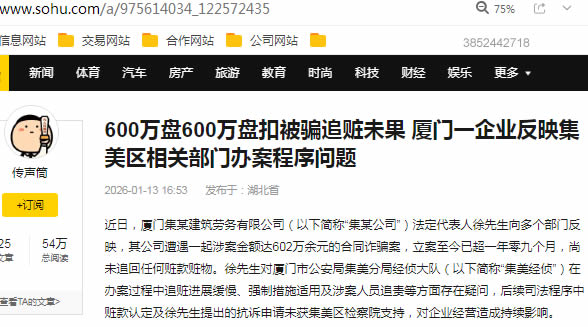 近日,厦门集某建筑劳务有限公司(以下简称“集某公司”)法定代表人徐先生向多个部门反映,其公司遭遇一起涉案金额达602万余元的合同诈骗案,立案至今已超一年零九个月,尚未追回任何赃款赃物。徐先生对厦门市公安局集美分局经侦大队(以下简称“集美经侦”)在办案过程中追赃进展缓慢、强制措施适用及涉案人员追责等方面存在疑问,后续司法程序中赃款认定及徐先生提出的抗诉申请未获集美区检察院支持,对企业经营造成持续影响。