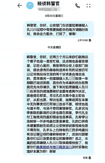 二是强制措施适用引发疑问。孔某川作为合同承租主体,名下仍有部分盘扣未归还,且与李某志存在多笔大额资金往来。但集美经侦对孔某川刑拘25天后,未按《刑事诉讼法》第九十一条规定在3-7日内提请检察院审查批捕,直接取保候审,且未说明法律依据。目前孔某川已被解除取保候审,徐先生担忧其串供、转移资产,导致赃款赃物更难追回。